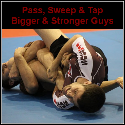 The closed guard is probably the least preferable spot to pass from against a larger and stronger opponent. You do not have any movement potential, your mobility is non-existent, and you are at risk for submissions. So, the first thing you must do if you end up in the closed guard of a much larger opponent is get the heck out.